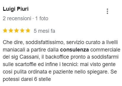 Disponibilità, competenza e professionalità. A partire dal sopralluogo, all'installazione e alla post vendita si sono dimostrati una ditta molto seria. Soddisfattissimo!