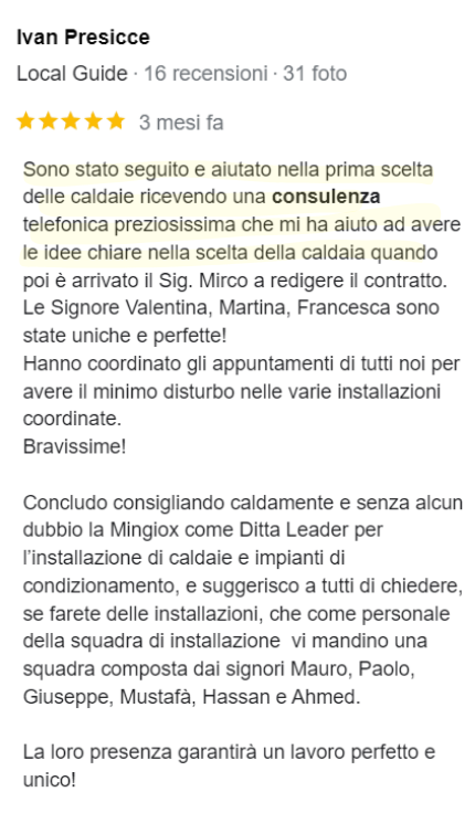 Ho interpellato questa ditta per cambiare la mia vecchia caldaia ed installarne una nuova a condensazione.Sopralluogo efficientissimo, mi danno l'appuntamento per l'installazione la settimana successiva.Purtroppo, la mia vecchia caldaia decide di rompersi definitivamente 5 giorni prima del giorno fissato per la sostituzione. Chiamo in ditta spiegando il mio problema e il giorno seguente, lavorando fino alle 21.30 mi installano la nuova caldaia!!!!!!!! Sono stati veramente fantastici, seri e professionali. Consiglio vivamente la Mingiox per la loro eccellente professionalità. Grazie, mi avete risolto un grosso problema in tempi brevissimi. Complimenti!!!!